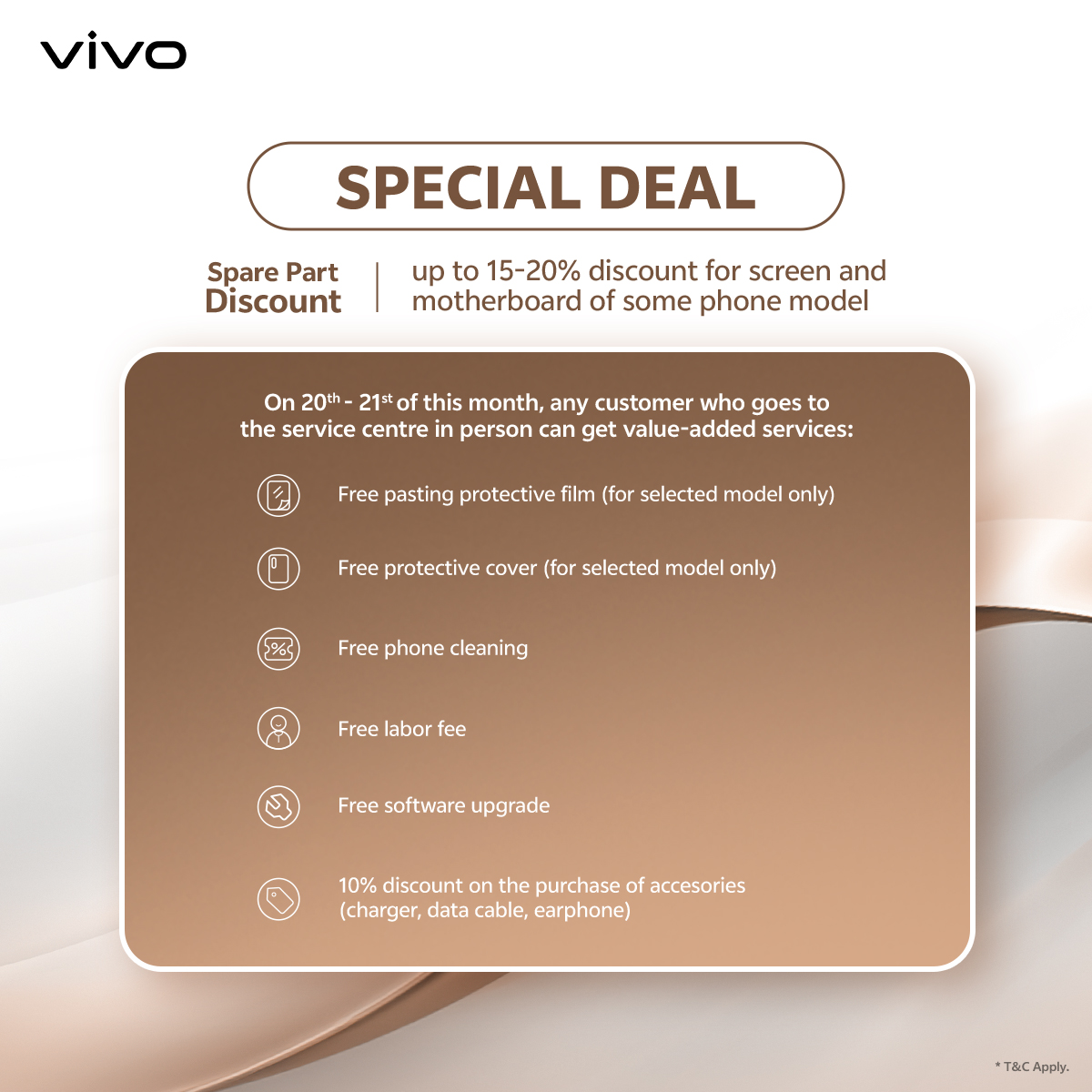 Are you ready for the vivo FREE SERVICE DAY? Enjoy even more value added services and exclusive discounts every 20th - 21st of each month at our vivo service center! (may change the date at local public holidays)