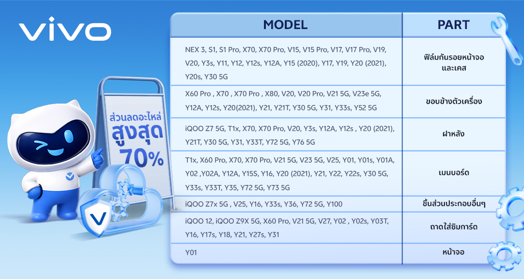 vivo มุ่งมั่นที่จะเปลี่ยนแปลงและเผยแพร่แนวทางการบริการของเราเพื่อมอบประสบการณ์การบริการลูกค้าที่ยอดเยี่ยมซ้ำแล้วซ้ำเล่า ดังนั้นอย่ารอช้า...ไปที่ศูนย์บริการอย่างเป็นทางการของ vivo สำหรับผู้ที่ต้องการซ่อมเครื่อง หรือเปลี่ยนชิ้นส่วนอะไหล่ของสมาร์ทโฟน vivo ครอบคุมทั้ง X, V และ Y Series รวมไปถึงหูฟังไร้สาย vivo TWS และรับส่วนลดชิ้นส่วนอะไหล่สูงสุดถึง 70% (ชิ้นส่วนบางรายการสามารถซ่อมได้ฟรี) สำรองการจองอะไหล่ก่อนเปลี่ยนได้ที่ศูนย์บริการใกล้คุณทั้ง 36 แห่งทั่วประเทศ https://bit.ly/3Ae5cHx อะไหล่มีจำนวนจำกัด
