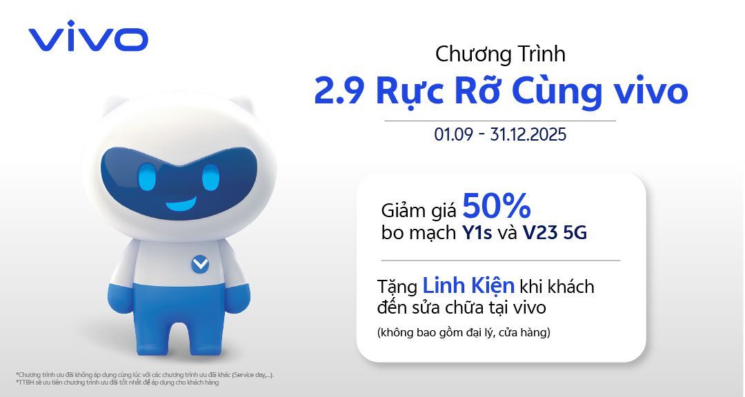 • Chương trình ưu đãi này không áp dụng cùng lúc với các chương trình ưu đãi khác (vd: Service day,...). TTCSKH vivo sẽ ưu tiên chương trình ưu đãi tốt nhất để áp dụng cho khách.