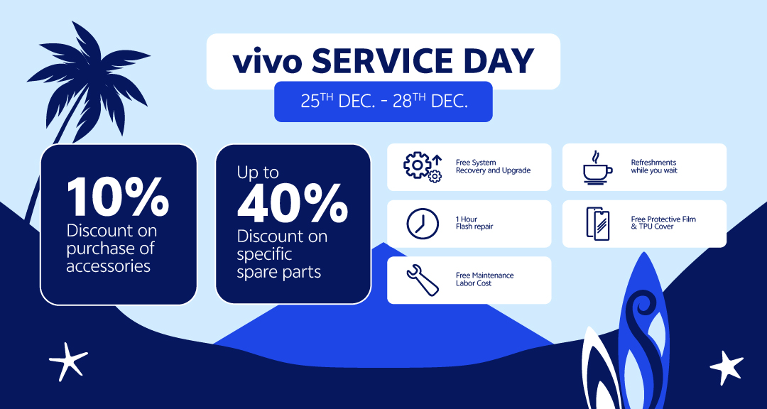 Visit our official service center on vivo SERVICE DAY between the 25th - 28th of each month for more value-added services and exclusive discounts!
